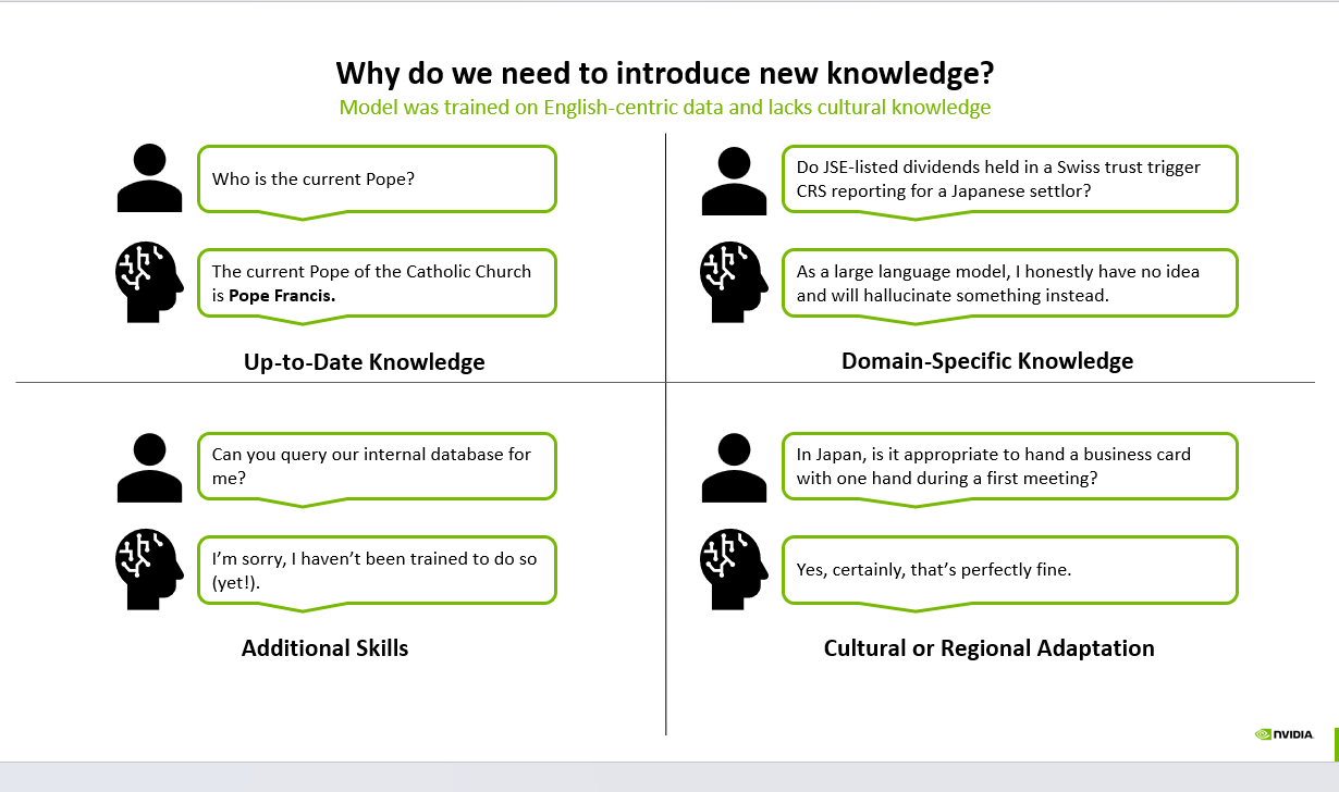 This article explores why updating and enriching AI knowledge is critical, based on four key dimensions: up-to-date knowledge, domain-specific knowledge, additional skills, and cultural adaptation.